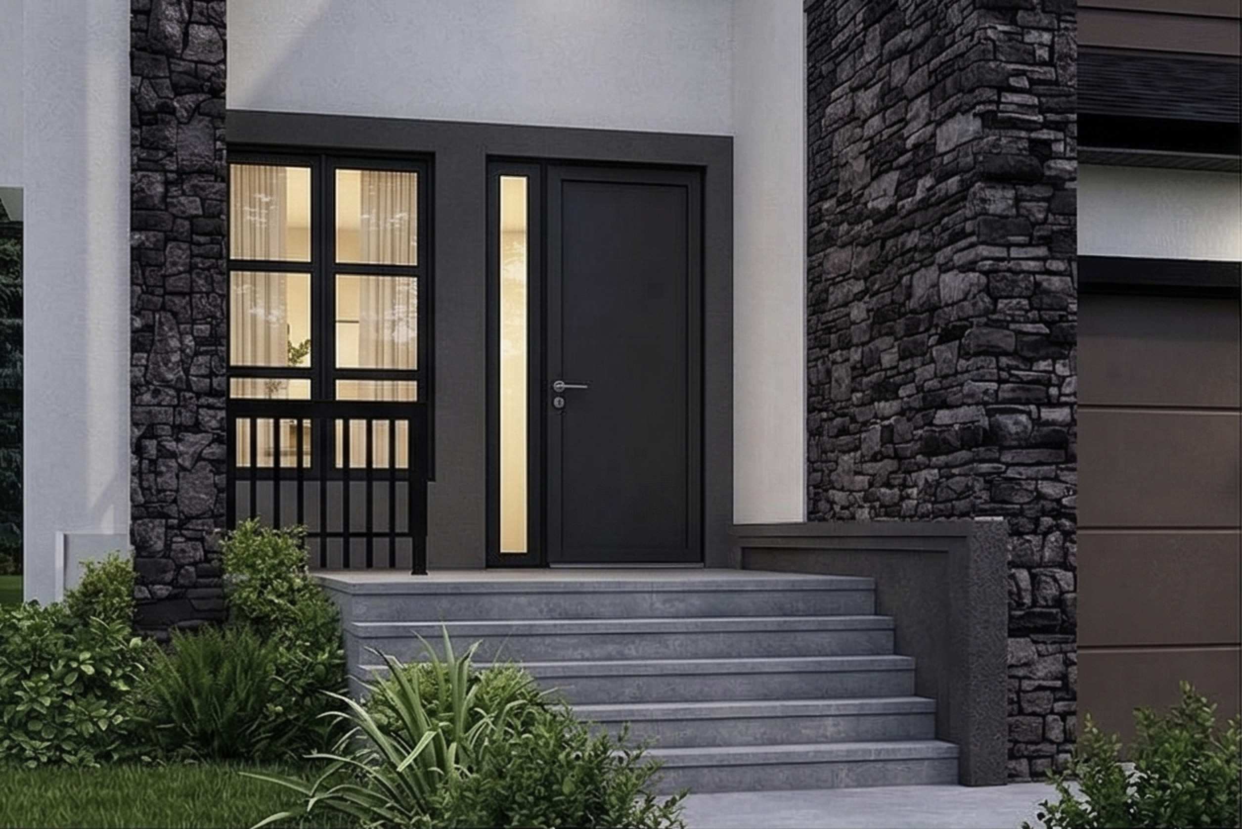 Clean lines, contrasting textures, and inviting interior spaces create a balanced design that feels both refined and livable within this growing Chestermere community.